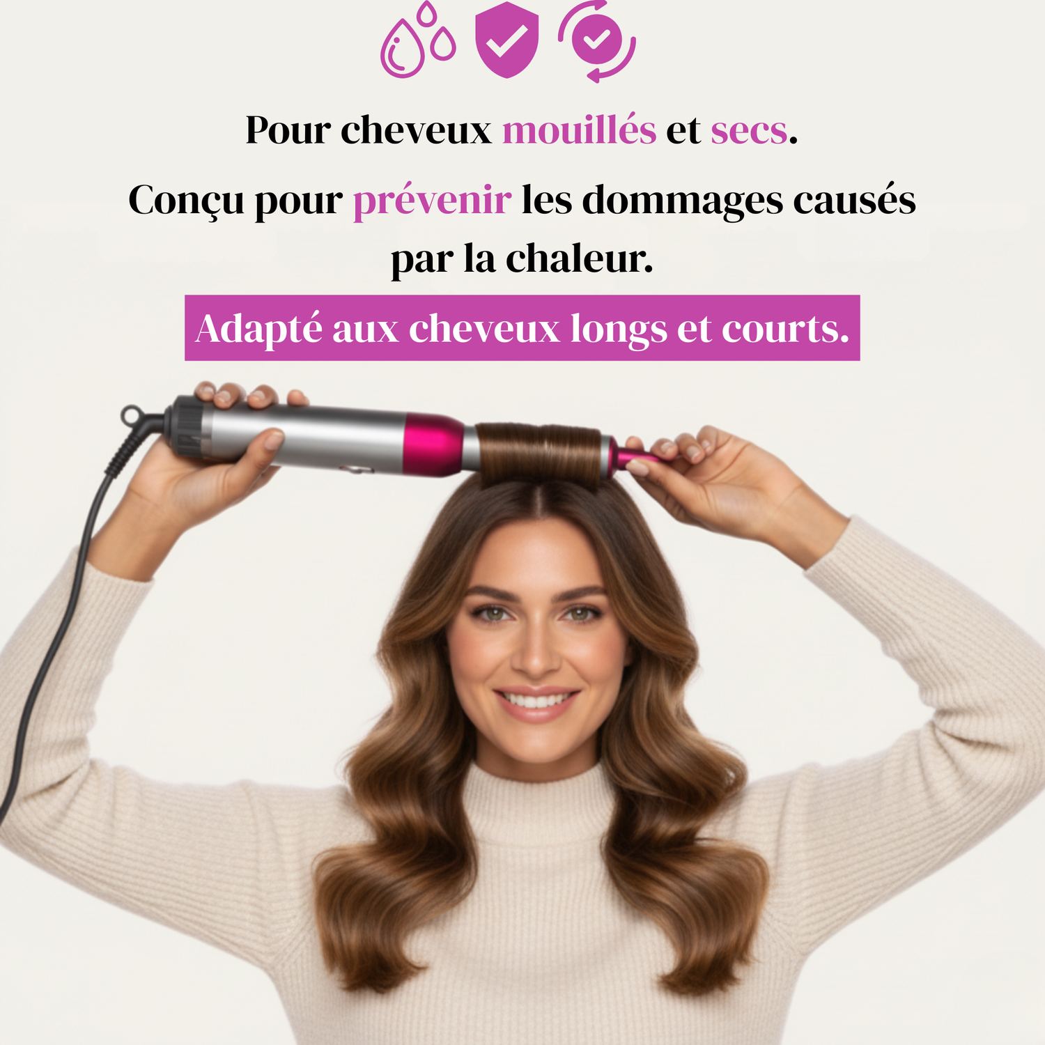 Oui ! Il fonctionne sur tous les types de cheveux — fins, épais, bouclés ou lisses — grâce à ses embouts interchangeables et à sa technologie ionique qui protège la fibre capillaire.